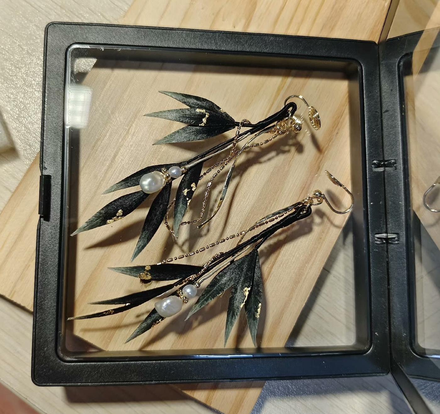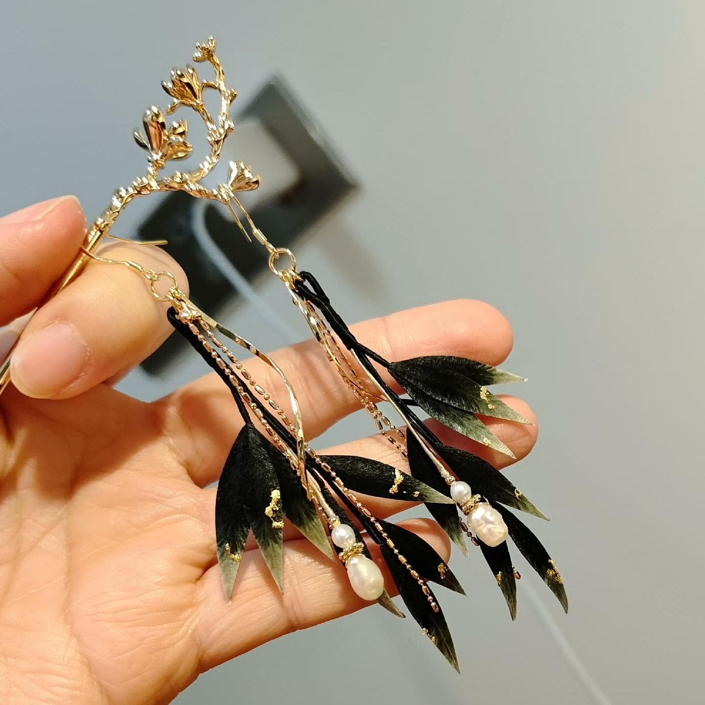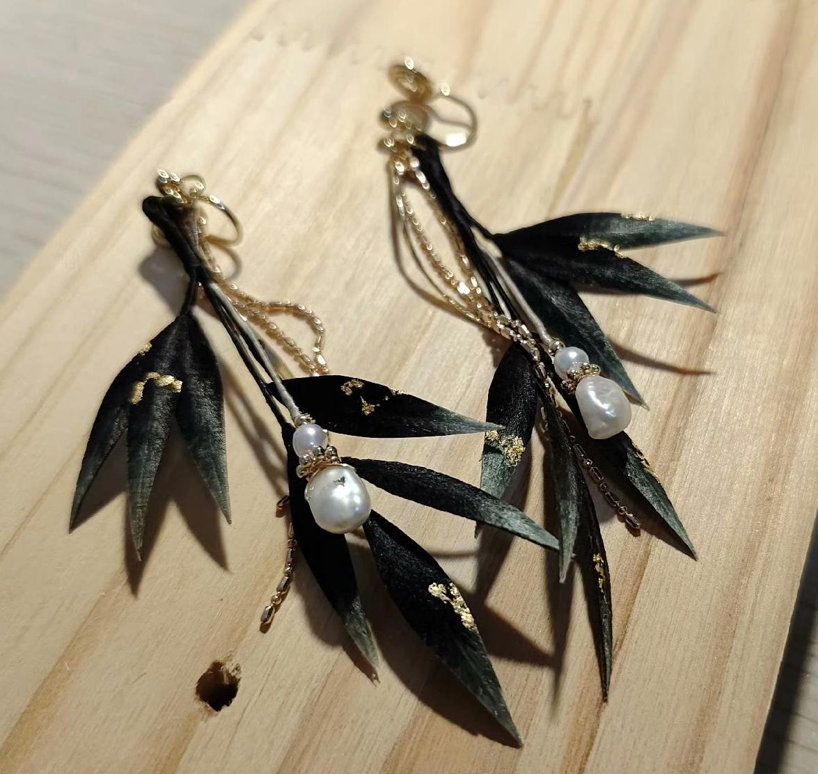 Black Bamboo Leaves Bespoke Earrings - Silk Earrings(Ronghua)