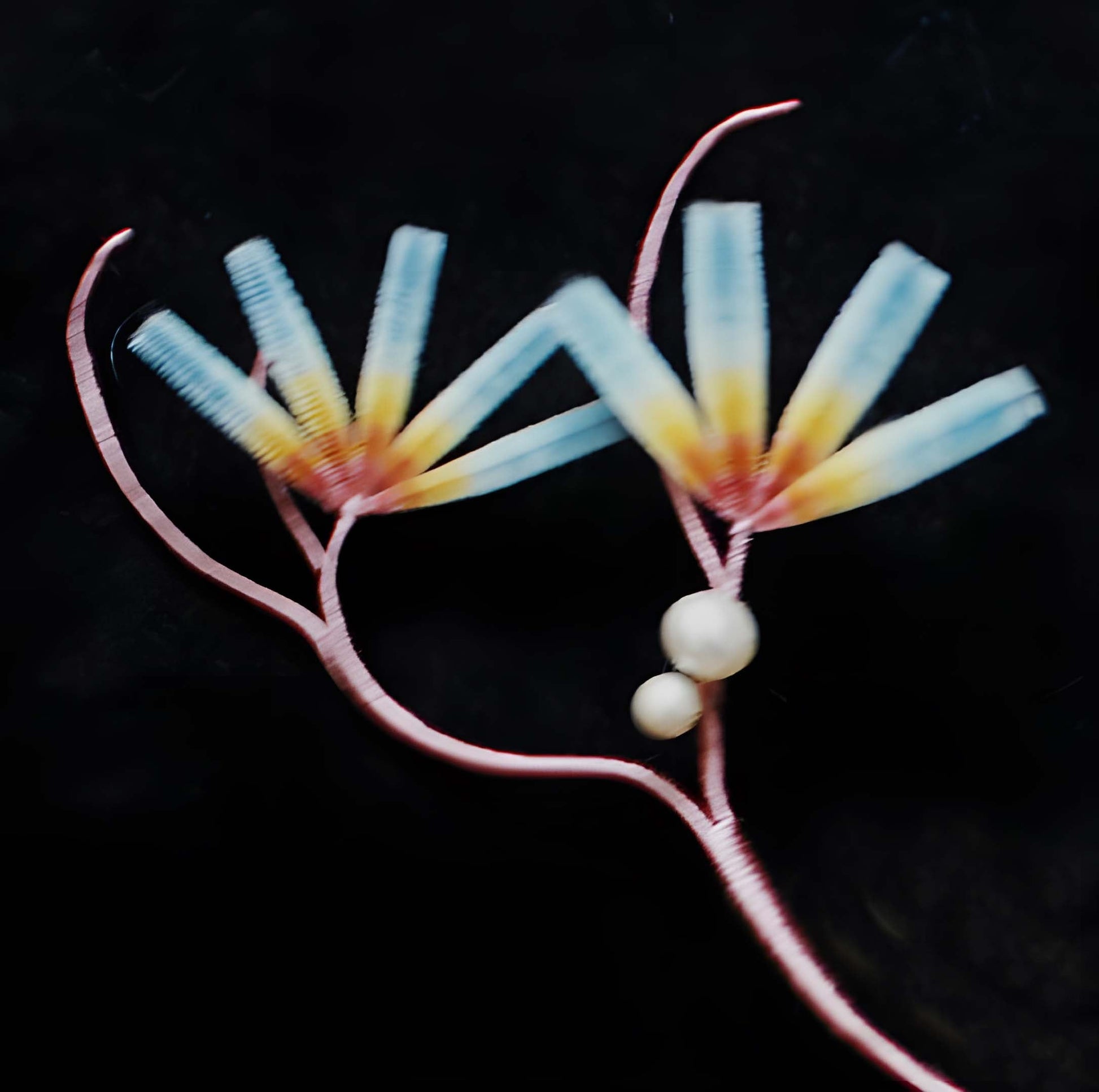 Materials: natural silk, freshwater pearls, copper fittings